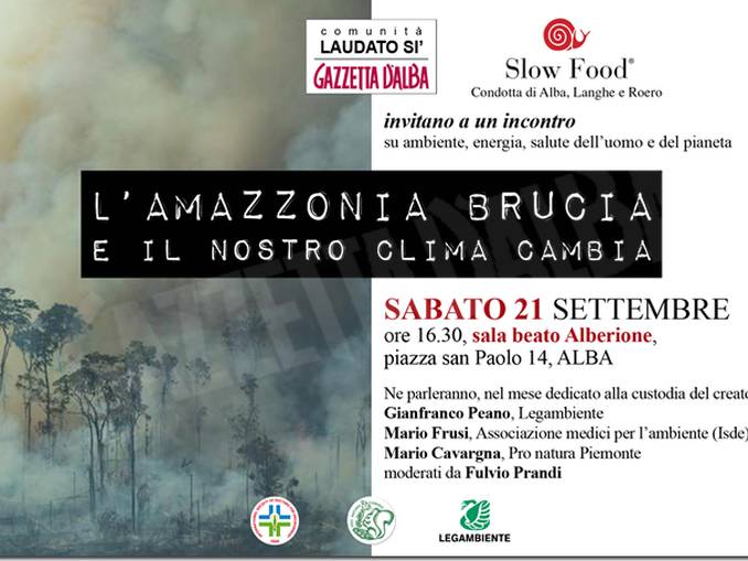 La comunità Laudato si’- Gazzetta d’Alba invita a partecipare all’incontro dal titolo “L’Amazzonia brucia e il nostro clima cambia” che si svolgerà sabato 21 settembre alle ore 16.30 nella sala Beato Alberione in piazza San Paolo 14 ad Alba.