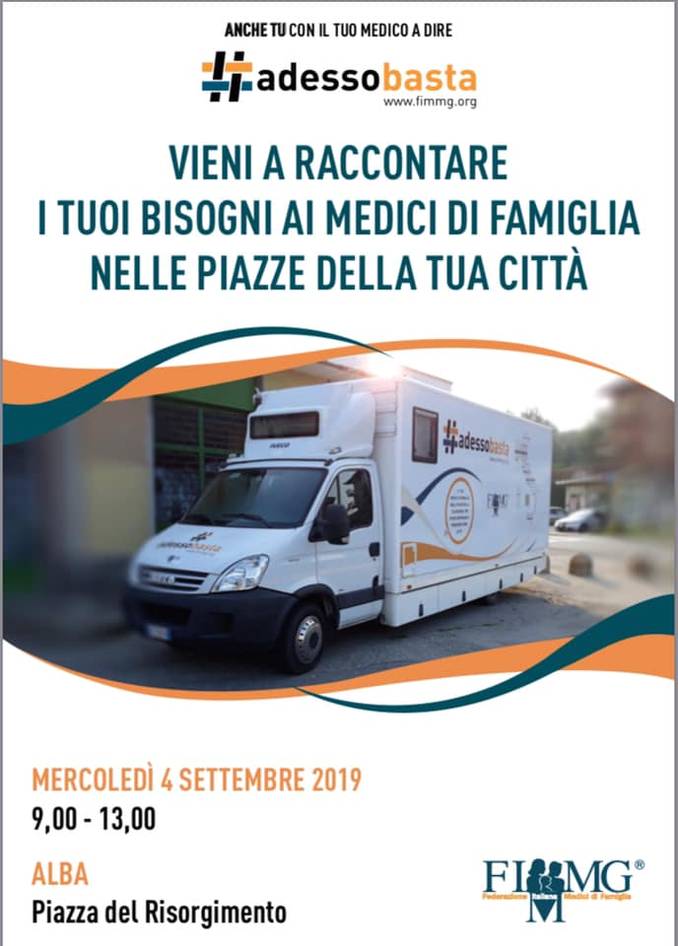 ALBA Questa mattina (mercoledì 4 settembre) fino alle 13 è presente in piazza Risorgimento il mezzo attrezzato della Fimmg, Federazione italiana medici di medicina generale per ascoltare i cittadini, accogliere i loro bisogni e le loro esigenze, nell’ottica di costruire insieme la medicina generale del futuro. Il mezzo si sposterà a Santo Stefano Belbo e resterà aperto dalle 15 alle 18 di oggi.