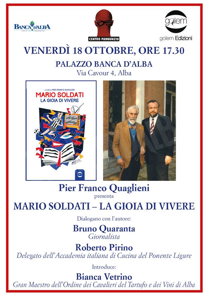 Pier Franco Quaglieni, che gli dedica un corposo saggio iniziale – contiene testimonianze autorevoli sull’attività poliedrica di Soldati nella letteratura, nel cinema, nel giornalismo, nella Tv, nel campo enogastronomico.