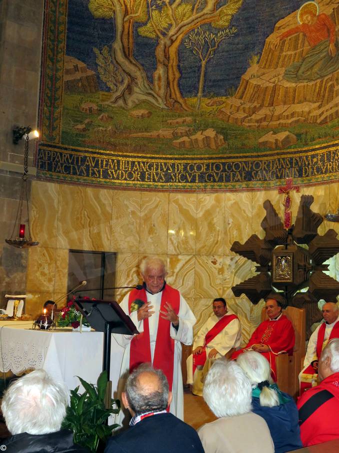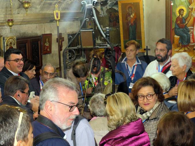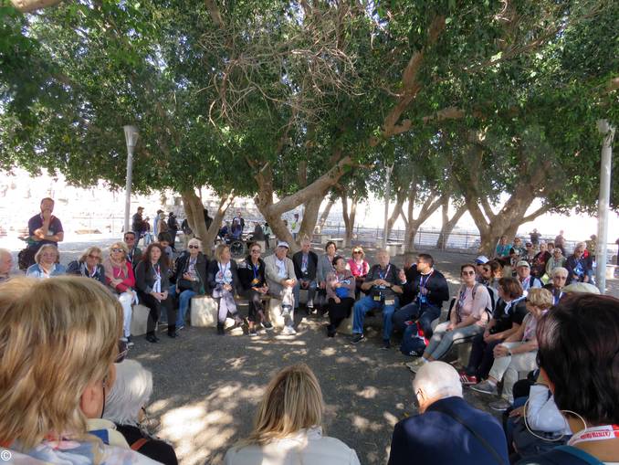 A Gerusalemme due incontri di primo piano, presso il Patriarcato con l’amministratore apostolico monsignor Pier Battista Pizzaballa e presso la Custodia con il custode di Terra Santa padre Francesco Patton. Il vescovo Pizzaballa ha messo in evidenza l’impegno pastorale svolto nelle parrocchie sparse nei molti villaggi della Palestina costituite da comunità di cristiani arabi. Così pure ha sottolineato il buon rapporto verso le altre confessioni cristiane e l’impegno nel dialogo interreligioso con i musulmani e gli ebrei. Il dramma denunciato dal pastore di questa Chiesa, che è la Chiesa madre della cristianità, è la quasi scomparsa della presenza dei cristiani, ridotta a meno del due per cento. Da parte sua, il custode Francesco Patton ha raccontato la storia della presenza dei Francescani in Terra Santa che ha il suo esordio con la venuta di san Francesco, di cui ricorrono gli 800 anni. Durante questi secoli tanti Francescani di Terra Santa hanno subito un martirio di carità e di sangue. Il primo dovuto a malattie letali prese curando malati infetti e il secondo da vere esecuzioni perpetrate dai potenti di turno a causa della loro fede. Una presenza capillare nei luoghi santi e un impegno variegato nel corso nei secoli. La presenza di oggi si caratterizza, oltre che per l’animazione pastorale dei santuari, per l’attività in molte scuole dove studiano non solo cristiani ma molti musulmani, favorendo un processo d’integrazione. Tutti questi incontri sono risultati l’altra faccia della medaglia del pellegrinaggio che, unita a tutte le visite dei luoghi e dei siti, ci ha permesso di avere una percezione non parziale ma sperimentare come la Terra di Gesù sia ancora viva e bisognosa della presenza dei pellegrini per non diventare un museo a cielo aperto, bensì rimanga il luogo dove scoprire le radici della nostra fede.