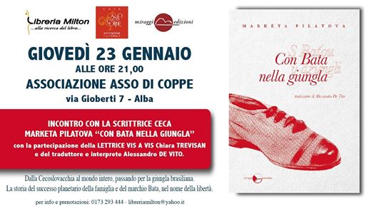 ALBA Questa sera, giovedì 23 gennaio alle 21, l’associazione Asso di coppe di via Gioberti e la libreria Milton propongono l’incontro con la giornalista e scrittrice ceca Marketa Pilatova che presenterà il suo libro Con Bata nella giungla, Miraggi edizioni.