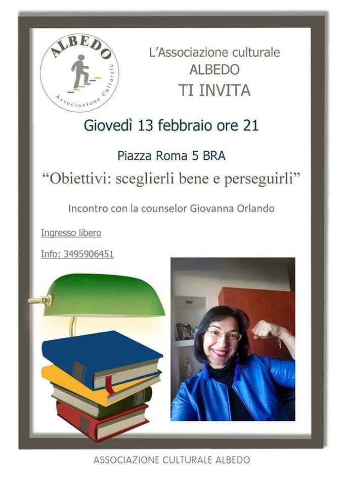 BRA Continuano i giovedì culturali con l’associazione culturale Albedo di Bra. Giovedì 13 febbraio in piazza Roma 5 alle 21 si parlerà di Obiettivi: sceglierli bene e perseguirli. Sarà presente Giovanna Orlando, una counselor, ossia una professionista che aiuta chi si trova in un grande stato di difficoltà a trovare nuovi spunti sulla ricerca di se stessi e dell’ambiente che li circonda. Il counselor è anche una guida per chi sta attraversando un particolare periodo della propria vita ricco di incertezze e difficoltà e viene aiutato a trovare la consapevolezza del proprio stato di coscienza.