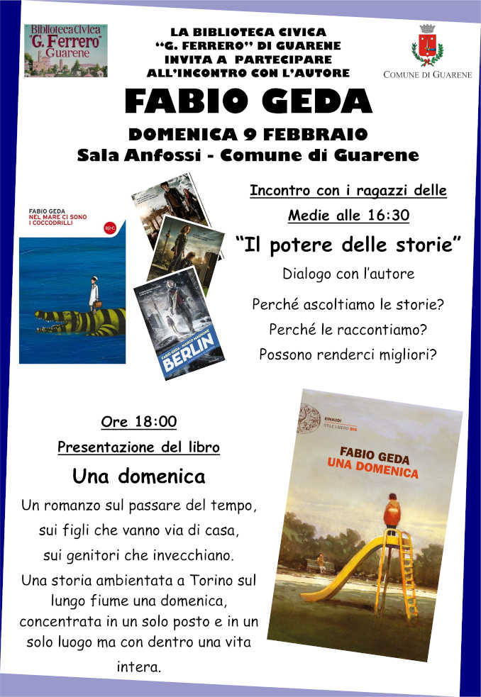 GUARENE Domenica 9 febbraio nella sala Anfossi del Comune di Guarene lo scrittore Fabio Geda presenterà il suo nuovo libro Una domenica (Einaudi). Alle 16.30 vi sarà un incontro con i ragazzi delle Medie sul “Potere delle storie”, cui seguirà alle 18 la presentazione del romanzo che si articola sul passare del tempo e della vita.