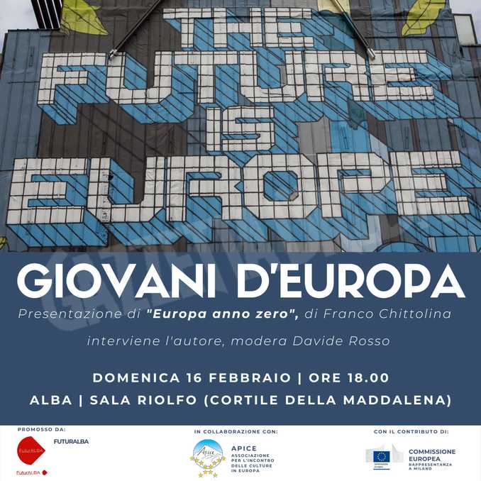 Domenica 16 febbraio, alle 18, in sala Riolfo, nel cortile della Maddalena, si terrà un momento di confronto dedicato alle nuove generazioni, dal titolo Giovani d’Europa. Durante l’appuntamento, organizzato dall’associazione giovanile albese Futuralba con la collaborazione di Apice (Associazione per l’incontro delle culture in Europa) e il contributo della Commissione europea, verrà presentato il libro Europa anno zero, scritto da Franco Chittolina