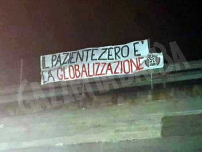 CUNEO Sono apparsi questa notte a Cuneo e ad Alba striscioni con la scritta “Il paziente zero è la globalizzazione” e il simbolo di Casapound che in una nota spiega: «Frontiere spalancate, quarantene non effettuate, una colpevole sottovalutazione del pericolo di diffusione del virus in Italia da parte del Governo non costituiscono mera superficialità ma sono effetto di un’ideologia nefasta, che ha da tempo rinunciato a qualsiasi difesa della sovranità nazionale per assecondare le peggiori pulsioni globaliste».