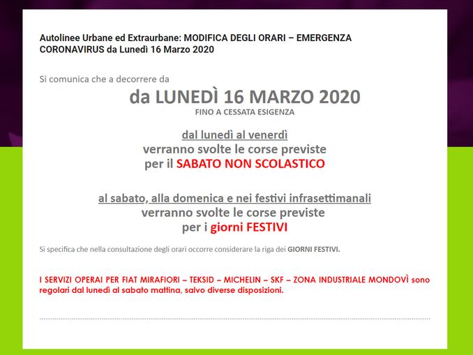 ALBA Da lunedì 16 marzo cambiano gli orari delle corse degli autobus urbani ed extraurbani di tutta la provincia di Cuneo. Il consorzio Grandabus a cui aderiscono 14 società di autolinee a causa dell’emergenza coronavirus ha deciso di adottare l’orario dei sabati non scolastici per tutti i giorni dal lunedì al venerdì (nella consultazione dei tabelloni occorre considerare la riga del sabato e verranno svolte le corse indicate con il quadratino sia pieno che vuoto e quelle indicate con il tondo. Le corse con il triangolo non vengono svolte) mentre nei giorni di sabato, domenica e nei festivi infrasettimanali verranno svolte le corse previste per i giorni festivi (nella lettura degli orari occorre considerare la riga dei giorni festivi e verranno svolte solo le corse indicate con il quadratino sia pieno che vuoto).