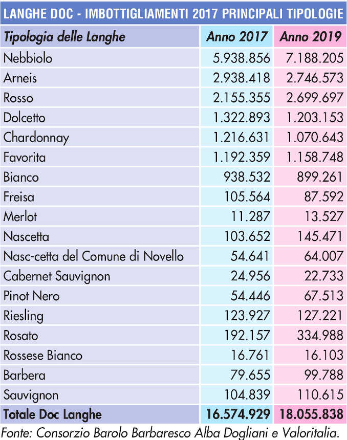 Analizzando i volumi delle varie tipologie balza agli occhi il dato del Langhe Nebbiolo, che nel 2019 raggiunge 7.188.205 bottiglie e tra i vini rossi del territorio si colloca al secondo posto, superato solo dal Barolo. Significativi sono anche i volumi imbottigliati di altre cinque tipologie: Langhe Arneis (2.746.573 bottiglie), Langhe Rosso (2.699.697), Langhe Dolcetto (1.203.153), Langhe Chardonnay (1.070.643) e Langhe Favorita (1.158.748).