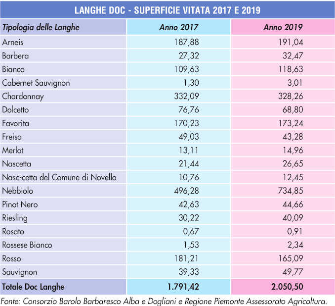 Il potenziale viticolo della Doc Langhe nel 2019 è di 2.050 ettari, con l’aumento di quasi 260 ettari rispetto al 2017. Va detto che questi sono i vigneti di stretto riferimento alla Doc Langhe, ma non sono gli unici: la Doc Langhe, infatti, può attingere anche dai vigneti iscritti alle denominazioni di primo livello.