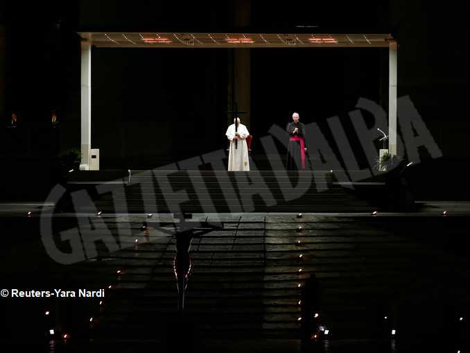 Una piazza deserta, quella di San Pietro. E accanto al Papa due sole presenze, testimoni di un’umanità dolente e ferita: il crocifisso miracoloso di San Marcello al corso, bagnato dalle “lacrime del cielo”, e l’icona della Vergine Salus populi romani. Ad accogliere le preghiere, ma anche la denuncia di Francesco: «Avidi di guadagno, non ci siamo fermati davanti ai tuoi richiami, non ci siamo ridestati di fronte a guerre e ingiustizie, non abbiamo ascoltato il grido dei poveri e del nostro pianeta gravemente malato. Abbiamo proseguito imperterriti, pensando di rimanere sempre sani in un mondo malato».