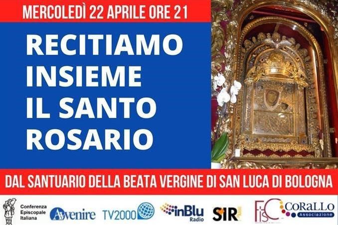Mercoledì 22 aprile alle 21 da Bologna il Rosario per l’Italia. La preghiera andrà in onda su Tv2000, Inblu radio e in diretta Facebook dal santuario della Beata Vergine di San Luca. A guidarlo sarà il cardinale Matteo Zuppi. Avvenire, Tv2000, InBlu radio, Sir, Federazione dei settimanali cattolici e Corallo, d’intesa con la segreteria generale della Cei, invitano i fedeli, le famiglie e le comunità religiose a ritrovarsi per recitare insieme il Rosario.