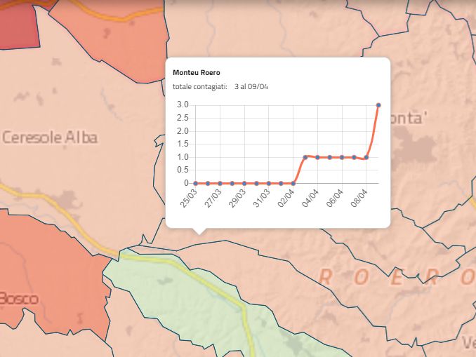 La mappa del contagio in Piemonte, pubblicata sul web e basata sui dati dell’epidemia gestiti dall’Unità di crisi, riporta tre casi a Monteu Roero, uno registrato il 3 aprile e altri due registrati ieri, giovedì 9.