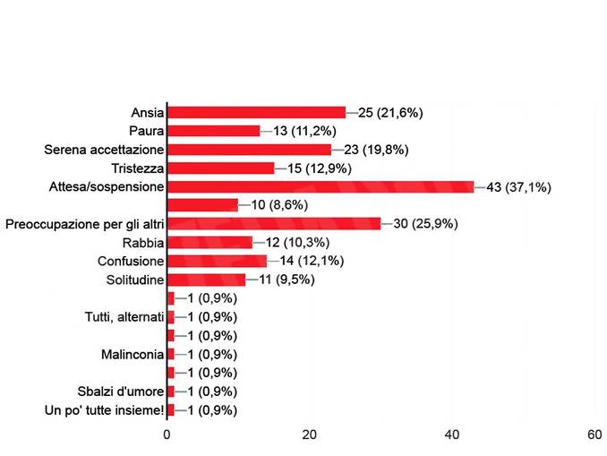 La quarantena, dunque, non si costituisce più come una condizione provvisoria e temporanea, ma come una linea di demarcazione netta tra prima e dopo. L’impianto socioeconomico e le stesse strutture di pensiero con cui le persone interpretano la realtà sembrano destinate alla metamorfosi. Quando, poi esploriamo l’emozione vissuta nei giorni di blocco forzato, la prima risposta, con il 37% circa, è la sensazione di «attesa e sospensione»; di seguito: «preoccupazione per gli altri» (26%), «ansia» (22); «serena accettazione» (20), «confusione» (12), «paura» (11), «rabbia» (10), «tristezza» (13) e «solitudine» (10).
