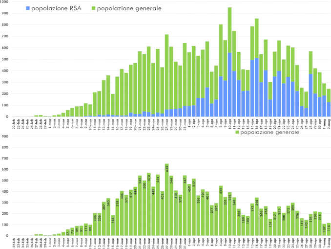 L’andamento dei casi Covid-19 positivi in Piemonte dal 22 febbraio per giorno di diagnosi fino al 2 maggio. Nel grafico in alto la parte del diagramma colorata in azzurro rappresenta il numero di casi positivi riscontrati nell’ambito delle Residenze sanitarie assistenziali per anziani (pari al 51% del totale delle diagnosi nel periodo 26 aprile 2 maggio) e quella in verde rappresenta il resto della popolazione. Nel grafico sotto sono riportati solo i casi registrati fuori dalle Rsa.