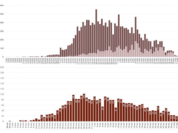 Il grafico in basso riporta l’andamento dei decessi in pazienti Covid-19 dal 28 febbraio al 2 maggio 2020. I dati più recenti potrebbero essere sottostimati sia per il ritardo di notifica sia perché ancora non confermati dal test virologico.
