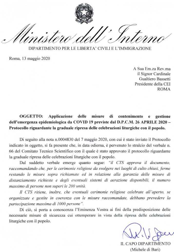 Di ciò, si porta a conoscenza l’eminenza vostra ai fini della predisposizione delle necessarie misure di sicurezza cui ottemperare in vista della ripresa delle celebrazioni liturgiche con il popolo.
