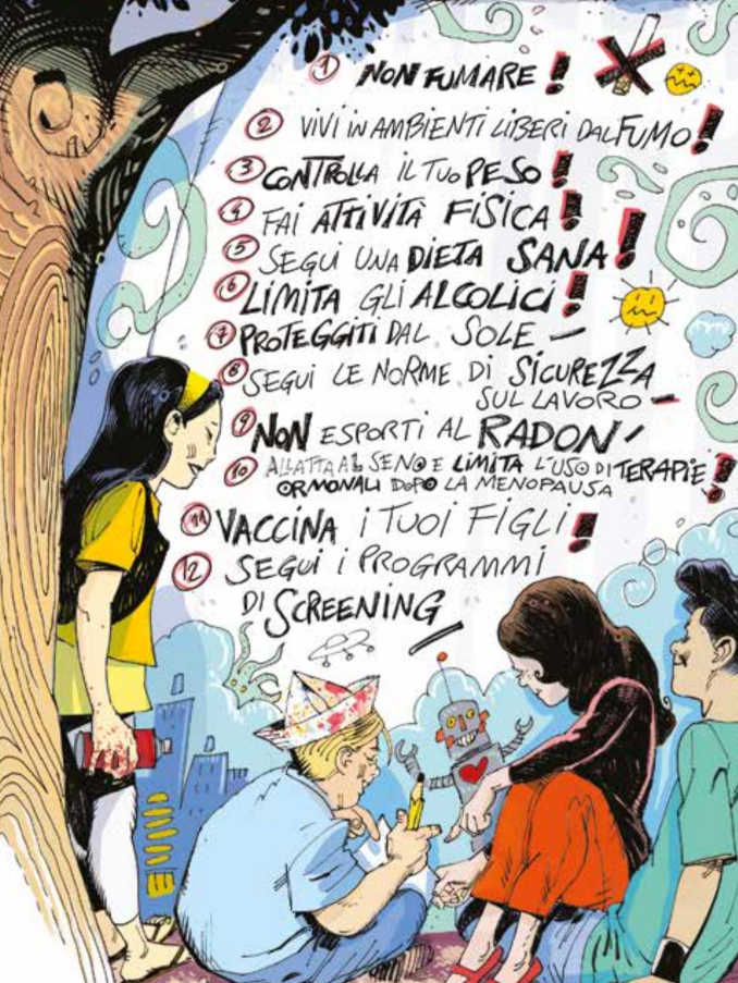 Non fumare, fare attività fisica, seguire una sana alimentazione, evitare gli alcolici e aderire ai programmi di vaccinazione adolescenziale per l’epatite B e il papillomavirus: sono solo alcune delle 12 Regole, protagoniste della “guida” in formato graphic novel, ideata da Maurizio Rosenzweig, uno dei più apprezzati fumettisti italiani, scaricabile gratuitamente dal sito web www.reteoncologica.it/graphic-novel-il-segreto-delle-12-regole, dove è possibile trovare anche tante informazioni sulla prevenzione oncologica e mettersi alla prova con i quiz di autovalutazione.