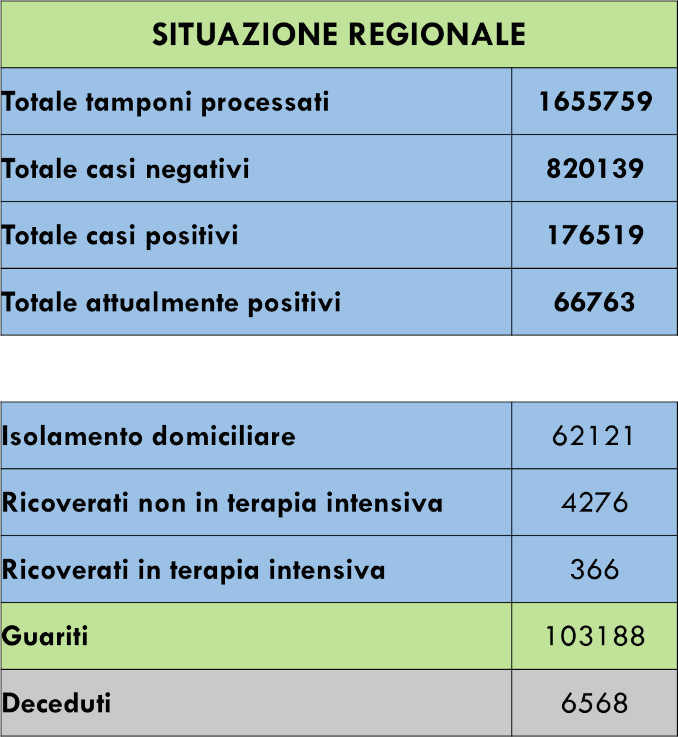 I tamponi diagnostici finora processati sono 1.655.759 (+15.100 rispetto a ieri), di cui 820.139 risultati negativi.