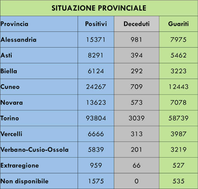 Il totale dei casi positivi diventa quindi 176.519, così suddivisi su base provinciale: 15.371 Alessandria, 8291 Asti, 6124 Biella, 24.267 Cuneo, 13.623 Novara, 93.804 Torino, 6666 Vercelli, 5839 Verbano-Cusio-Ossola, oltre a 959 residenti fuori regione ma in carico alle strutture sanitarie piemontesi. I restanti 1575 sono in fase di elaborazione e attribuzione territoriale.