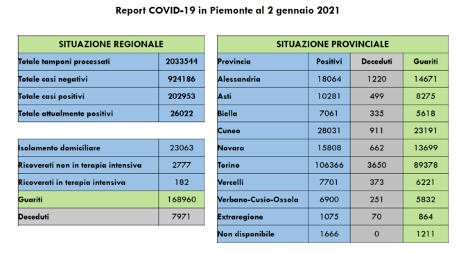 Sono 11 i decessi di persone positive al test del Covid-19 comunicati dall’Unità di crisi della Regione Piemonte, di cui nessuno verificatosi oggi (si ricorda che il dato di aggiornamento cumulativo comunicato giornalmente comprende anche morti avvenuti nei giorni precedenti e solo successivamente accertati come decessi Covid). Il totale è ora di 7.971 deceduti risultati positivi al virus.