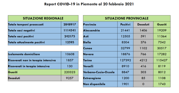 TORINO Oggi, sabato 20 febbraio, l’Unità di crisi della Regione Piemonte ha comunicato 765 nuovi casi di persone risultate positive al Covid-19 (di cui 108 dopo test antigenico), pari al 3,7% dei 20.595 tamponi eseguiti, di cui 14.138 antigenici. Dei 765 nuovi casi, gli asintomatici sono 253 (33,1 %). I casi sono così ripartiti: 103 screening, 404 contatti di caso, 258 con indagine in corso; per ambito: 12 Rsa/Strutture socio-assistenziali, 85 scolastico, 668 popolazione generale. Il totale dei casi positivi diventa quindi 242.175.