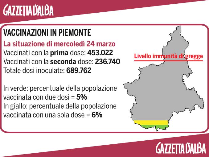 Dall’inizio della campagna si è quindi proceduto all’inoculazione di 689.762 dosi (delle quali 236.740 come seconda), corrispondenti al 78,6% delle 877.770 finora disponibili per il Piemonte (la percentuale è inferiore a quella di ieri perché comprende i nuovi caricamenti di Pfizer).
