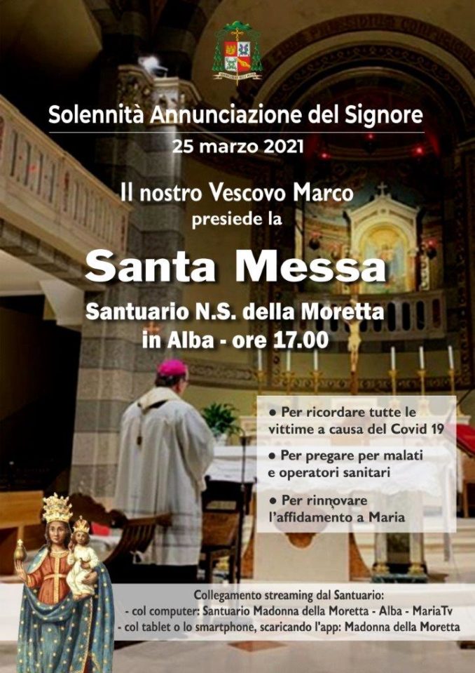 ALBA Il vescovo Marco Brunetti, giovedì 25 marzo, solennità dell’annunciazione del Signore, celebrerà una Messa al santuario Nostra Signora della Moretta in Alba per le vittime della pandemia, per i malati e gli operatori sanitari e per rinnovare l’affidamento a Maria.