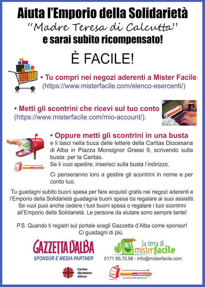 ALBA Il circuito di Mister facile, in collaborazione con il giornale, ha messo a punto nel suo portale un meccanismo che consente di sostenere l’Emporio della solidarietà Madre Teresa di Calcutta attraverso gli acquisti che gli iscritti eseguono presso i numerosi negozi aderenti al circuito (www.misterfacile.com/elenco-esercenti/).