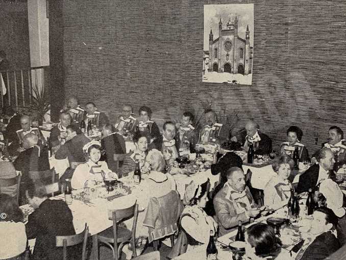 Si direbbe proprio la leggendaria, ospitale Tavernetta dell’hotel Savona. Il fotografo fa qualche slalom, e scatta per l’album dei ricordi; la serie delle fotografie ha il timbro della bottega (passata ormai anch’essa alla storia) Liuzzi. La coppia in primo piano: la signora Clotilde Degiacomi condotta dall’economo del Comune, Luigi Bertoncini. Un nome che ci fa piacere ritrovare, e “vedere”. Lo rileggiamo ogni volta che torniamo all’invenzione del Palio degli asini: nel 1932 il venticinquenne Bertoncini (nato nel 1907, morirà nel 1989) è al fianco di Pinot Gallizio; e fino al 1935, quando il suo albo d’oro si interrompe una prima volta (forse davvero il regime non gradiva l’implicito connotato satirico, e peggio: antieroico?) del Palio si corrono tre edizioni. Tutte e tre le vince il borgo dei postiglioni: di cui è presidente proprio Bertoncini. Che appena finita la guerra ritroviamo puntuale nel comitato organizzatore della rinata Fiera del tartufo, come già suo padre, il cavalier Giuseppe, era stato «tra gli organizzatori della “Fiera-mostra dei rinomati tartufi d’Alba”» nel 1929, quando Giacomo Morra iniziava la sua scommessa e la sua leggenda. Lo ricordava Vittorio Riolfo, ricapitolando, nel 1975, le memorie dei primi vent’anni della Famija albèisa: è ancora Bertoncini (Luigi) il primo tessitore «di contatti con amici con i quali aveva in comune il pallino di far qualcosa per Alba, al di sopra e al di fuori dell’attività delle pubbliche amministrazioni».