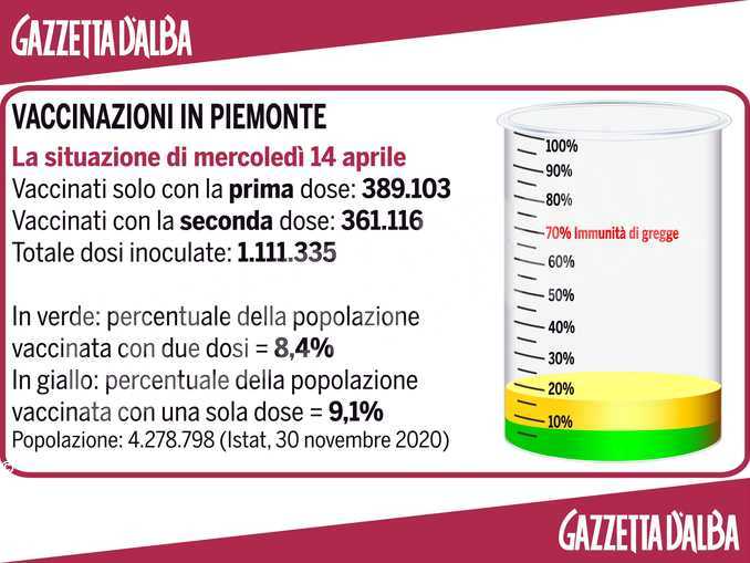VACCINAZIONI Sono 26.871 le persone che hanno ricevuto il vaccino contro il Covid comunicate nella serata di mercoledì 14 aprile all’Unità di crisi della Regione Piemonte (dato delle ore 19.30). A 4.392 persone è stata somministrata la seconda dose. Sono 7.028 gli over 80 e 9.976 i settantenni inculati ieri, di cui 2.884 vaccinati dai propri medici di famiglia.