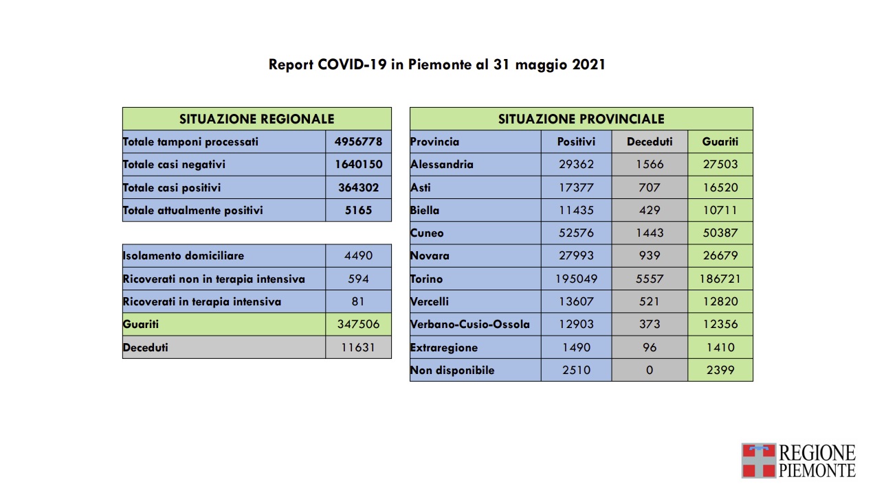 Il totale è ora di 11.631 deceduti risultati positivi al virus, così suddivisi per provincia: 1.566 Alessandria, 707 Asti, 429 Biella, 1.443 Cuneo, 939 Novara, 5.557 Torino, 521 Vercelli, 373 Verbano-Cusio-Ossola, oltre a 96 residenti fuori regione, ma deceduti in Piemonte.
