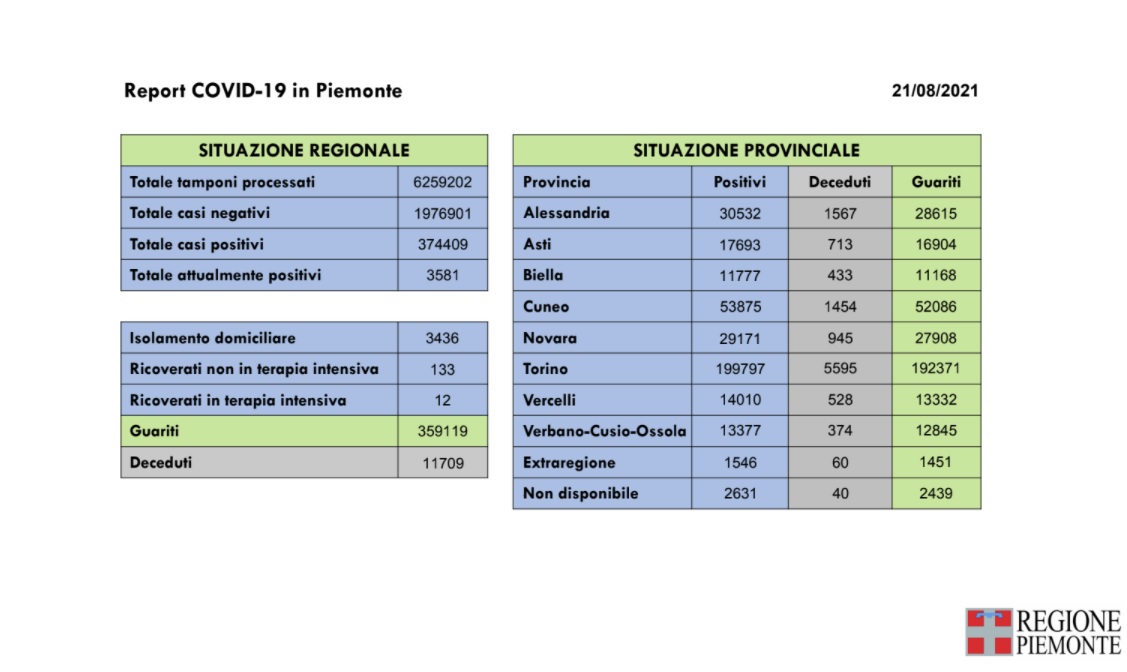 Il totale dei casi positivi diventa quindi 374.409 così suddivisi su base provinciale: 30.532 Alessandria, 17.693 Asti, 11.777 Biella, 53.875 Cuneo, 29.171 Novara, 199.797 Torino, 14.010 Vercelli, 13.377 Verbano-Cusio-Ossola, oltre a 1.546 residenti fuori regione, ma in carico alle strutture sanitarie piemontesi. I restanti 2.631 sono in fase di elaborazione e attribuzione territoriale.