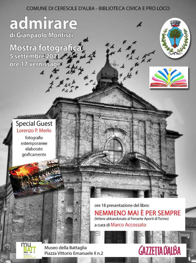 CERESOLE Comune, Biblioteca civica e Pro loco di Ceresole d’Alba organizzano, nel Museo della battaglia in piazza Vittorio Emanuele II numero 2 la mostra Admirare con gli scatti di Gianpaolo Montisci.