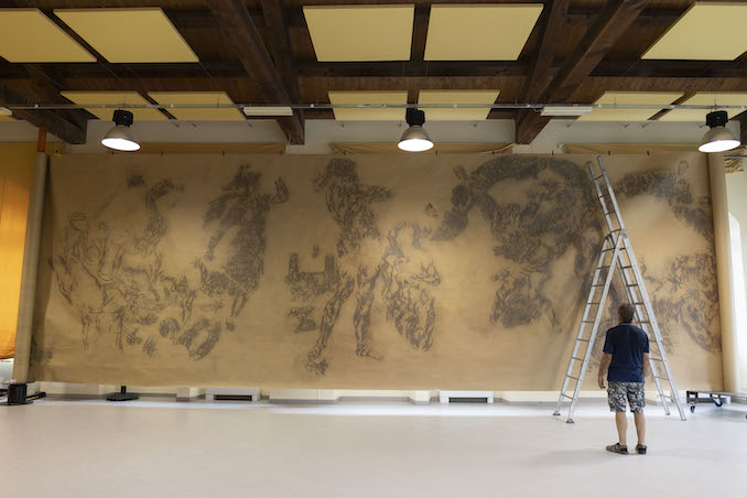 Dopo la prima settimana di mostra – che l’aveva vista in verticale per la prima volta, sviluppando 35 metri sui 97 totali di lunghezza e 4 di altezza – la colossale opera ritorna appoggiata in parte a terra come è stata concepita dall’artista, che avrà la possibilità di lavorarci ancora su.