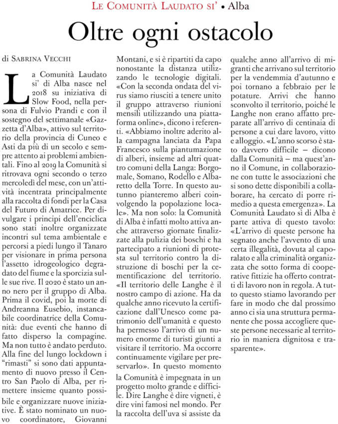 Laudato si’: la Comunità di Alba sull’Osservatore romano
