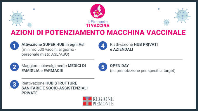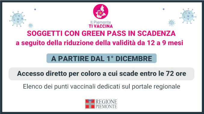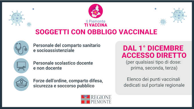 In caso di problemi rimane valida la possibilità di modificare la data sul portale regionale ilpiemontetivaccina.it. Fanno eccezione a questo meccanismo i piemontesi che rientrano nelle fasce per le quali è previsto l’obbligo vaccinale: il personale sanitario e, con il nuovo decreto, anche personale scolastico e forze dell’ordine. «Per queste persone, che riceveranno comunque il messaggio di convocazione, è possibile anche vaccinarsi in accesso diretto presso gli hub vaccinali territoriali, senza alcuna prenotazione, a partire dal 1° dicembre». Rientrano nella possibilità dell’accesso diretto anche le persone con green pass in scadenza delle 72 ore successive. Per tutti, a prescindere dalla data di convocazione tramite Sms, sarà possibile prenotarsi e ricevere la terza dose presso una farmacia aderente alla campagna vaccinale, così come presso il proprio medico di famiglia, se è un vaccinatore. Così come si potrà accedere, sempre su prenotazione, agli open day organizzati in hub pubblici o privati con riferimento a determinate categorie di persone.
