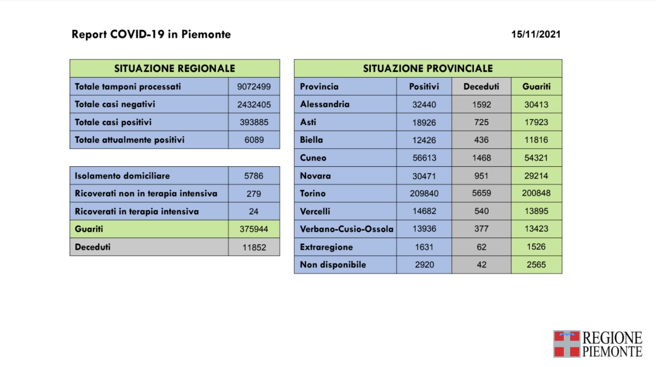 Il totale dei casi positivi diventa 393.885,così suddivisi su base provinciale: 32.440 Alessandria, 18.926 Asti, 12.426 Biella, 56.613 Cuneo, 30.471 Novara, 209.840 Torino, 14.682 Vercelli, 13.936 Verbano-Cusio-Ossola, oltre a 1.631 residenti fuori regione ma in carico alle strutture sanitarie piemontesi. I restanti 2.920 sono in fase di elaborazione e attribuzione territoriale.