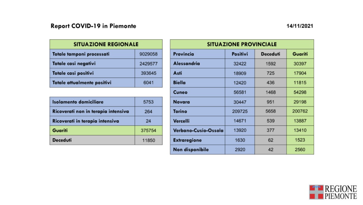 Il totale diventa quindi 11.850 deceduti risultati positivi al virus, così suddivisi per provincia:1.592 Alessandria, 725 Asti, 436 Biella, 1.468 Cuneo, 951 Novara,5.658 Torino, 539 Vercelli, 377 Verbano-Cusio-Ossola, oltre a 104 residenti fuori regione ma deceduti in Piemonte.