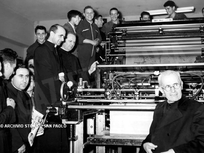 In punto di morte, ricevette la visita di Paolo VI (nella foto grande in visita a una tipografia paolina); Giovanni Paolo II l’ha proclamato beato nel 2003, mentre il primo paolino a salire agli onori degli altari è stato il suo stretto collaboratore il narzolese Timoteo Giaccardo, nel 1989.