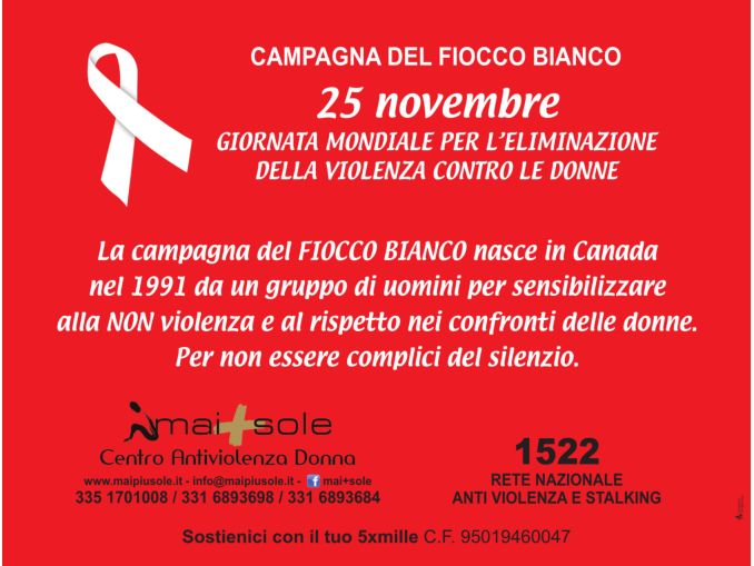 - L’associazione Mai più sole di Alba, dal 25 novembre distribuirà ai locali e ai negozi della città le tovagliette che promuovo l’iniziativa del fiocco bianco. Il nastro bianco ha in sé un significato di grande importanza: esso riassume l’impegno che gli uomini hanno deciso di portare avanti in prima persona, per dire no alla violenza sulle donne.