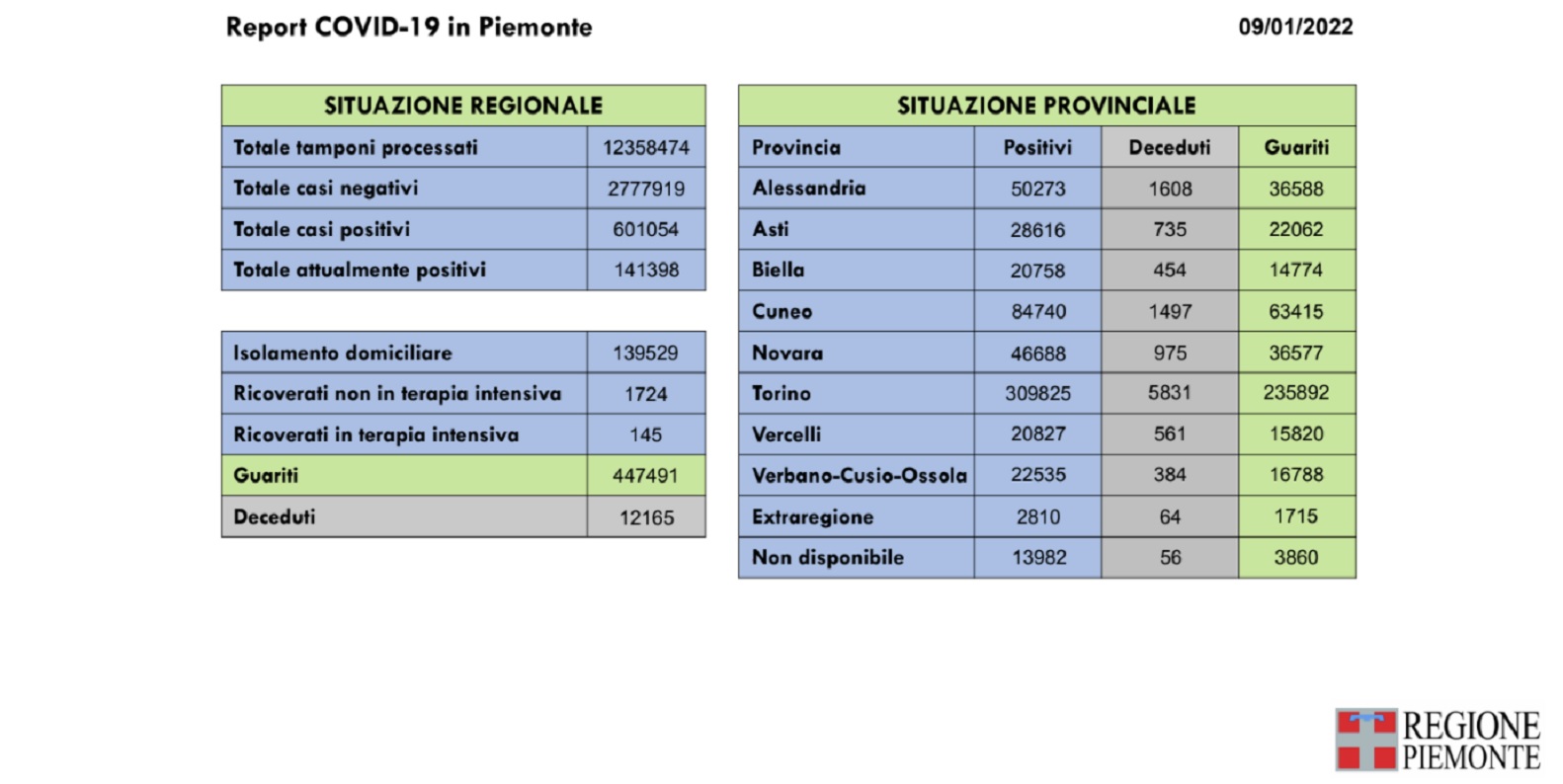 Il totale dei casi positivi diventa 601.054, così suddivisi su base provinciale: 50.273 Alessandria, 28.616 Asti, 20.758 Biella, 84.740 Cuneo, 46.688 Novara, 309.825 Torino, 20.827 Vercelli, 22.535 Verbano-Cusio-Ossola, oltre a 2.810 residenti fuori regione ma in carico alle strutture sanitarie piemontesi. I restanti 13.982 sono in fase di elaborazione e attribuzione territoriale.