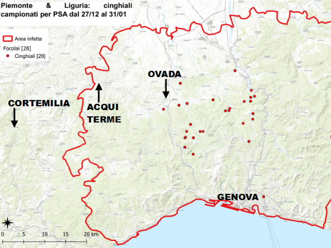 L’aggiornamento del 31 gennaio dell’Istituto zooprofilattico sperimentale Piemonte Liguria Valle d’Aosta, che esegue le analisi, è di 28 cinghiali positivi, 14 in Piemonte e altrettanti in Liguria.