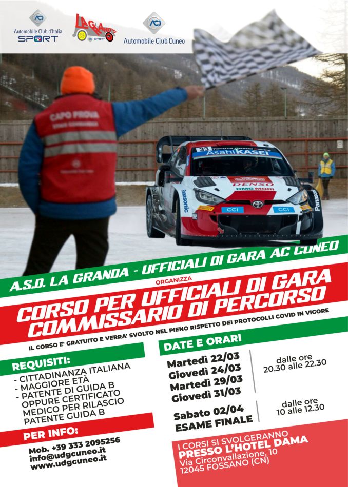 AUTOMOBILISMO Si terrà all’hotel Dama di Fossano in via Circonvallazione 10, nelle serate di martedì 22, giovedì 24, martedì 29 e giovedì 31 marzo dalle 20.30 il corso per ufficiali di gara nei rally, slalom, velocità in salita e velocità su ghiaccio.