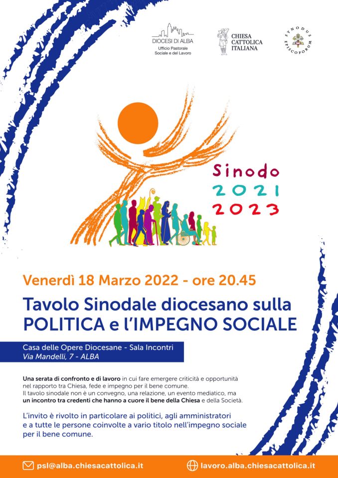 L’iniziativa dell’Ufficio diocesano per la pastorale sociale e del lavoro nasce nell’ambito del Cammino sinodale intrapreso dalla diocesi di Alba insieme a tutte le Chiesa locali italiane. In questa prima fase del Cammino sinodale, molto spazio è dato all’ascolto. «I due appuntamenti non vogliono essere un convegno o una relazione, ma un tempo di ascolto, di confronto e proposta. Tutti coloro che parteciperanno saranno invitati a condividere la propria esperienza, evidenziare le proprie difficoltà ma soprattutto a concludere con proposte di rilancio positivo e propositivo», sottolinea il responsabile dell’Ufficio, Michael Isnardi. «Riteniamo doveroso dare spazio e voce a tutti coloro che stanno vivendo un impegno in ambito politico e civile ma anche nel mondo del lavoro. Desideriamo che proprio chi vive con passione questi spazi e vorrebbe che la Chiesa avesse ancora più attenzione e cura per questi ambienti, possa dare un contributo al Cammino sinodale che si è ormai avviato».