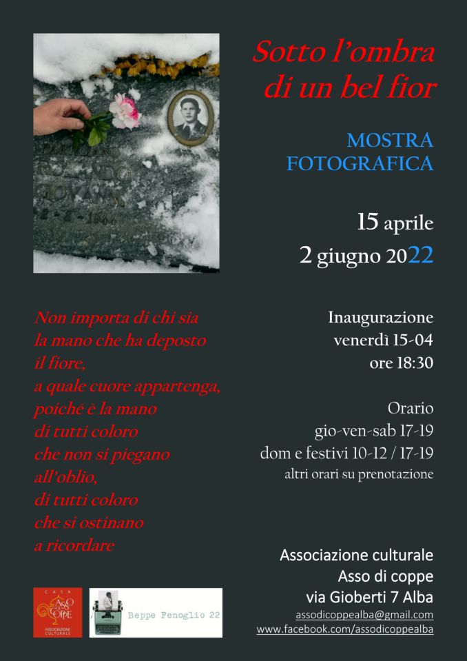 ALBA Sarà inaugurata venerdì 15 aprile alle 18.30 all’associazione culturale Asso di coppe di Alba, in via Gioberti 7, la mostra fotografica Sotto l‘ombra di un bel fior, evento inserito nel calendario ufficiale del centenario di Beppe Fenoglio.