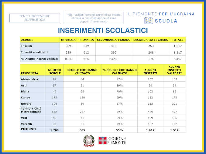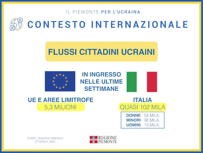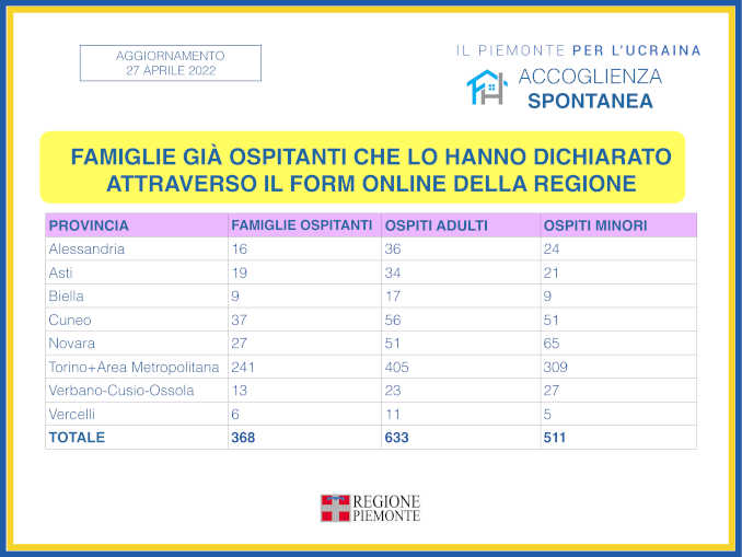 TORINO Sono 9.794 gli ucraini accolti in Piemonte; la maggior parte di loro, 8.633, sono ospitati nelle famiglie mentre poco più di mille presone hanno trovato assistenza in strutture della Protezione civile o nei Cas-Sai del servizio di accoglienza.