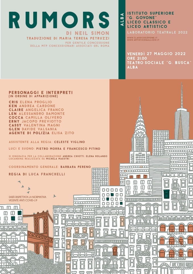 Il regista Luca Franchelli, che gestisce il laboratorio teatrale degli studenti del Govone con la collega Barbara Pereno, racconta: «Nella primavera del 2020 Rumors era pronto per andare in scena, ma abbiamo dovuto aspettare due anni per presentarlo. Con nuovi interpreti ci siamo impegnati nella costruzione dello stesso lavoro, anche nella speranza di dividere l’applauso con chi si era tanto impegnato, senza avere la possibilità finalizzare il lavoro di prova. Rumors rappresenta un classico del teatro leggero, con il suo meccanismo perfetto costruito per esaltare il lavoro di nove attori che non potranno distrarsi mai. Un esame insidioso per le nostre cinque attrici e per i nostri quattro attori, arrivati alla messinscena dopo mesi di prova massacranti. Ma nessuno si è tirato indietro e ognuno di loro ha cercato di impegnarsi per raggiungere un traguardo ottenibile soltanto concentrandosi al massimo e aiutando i compagni sul palco».