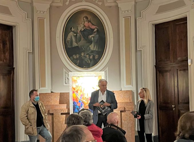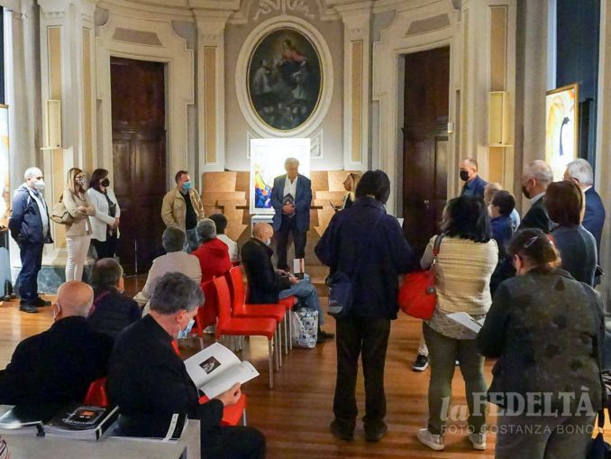 Brillantemente introdotto da Walter Lamberti ha preso la parola il vescovo Delbosco, che ha espresso tutto il suo compiacimento per l’iniziativa, con l’auspicio che i quadri vengano valorizzati in modo adeguato alla loro importanza e al loro significato nella collocazione definitiva al santuario di Cussanio. Dopo di lui ha preso la parola il e Rettore di Cussanio mons. Chiaramello, che ha promosso e suggerito la realizzazione dei sette quadri, poi donati da Blandino “alla intera comunità fossanese”, intesi come preziosa testimonianza e momento divulgativo.
