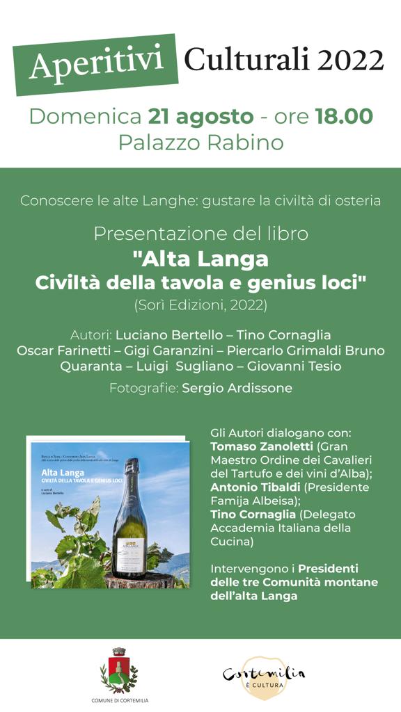 CORTEMILIA Prosegue la serie degli Aperitivi culturali a palazzo Rabino. Domenica 21 agosto alle 18 è in programma la presentazione del libro Alta Langa civiltà della tavola e genius loci (Sorì edizioni) scritto da Luciano Bertello, Tino Cornaglia, Oscar Farinetti, Gigi Garanzini, Piercarlo Grimaldi, Bruno Quaranta, Luigi Sugliano e Giovanni Tesio con le fotografie di Sergio Ardissone.