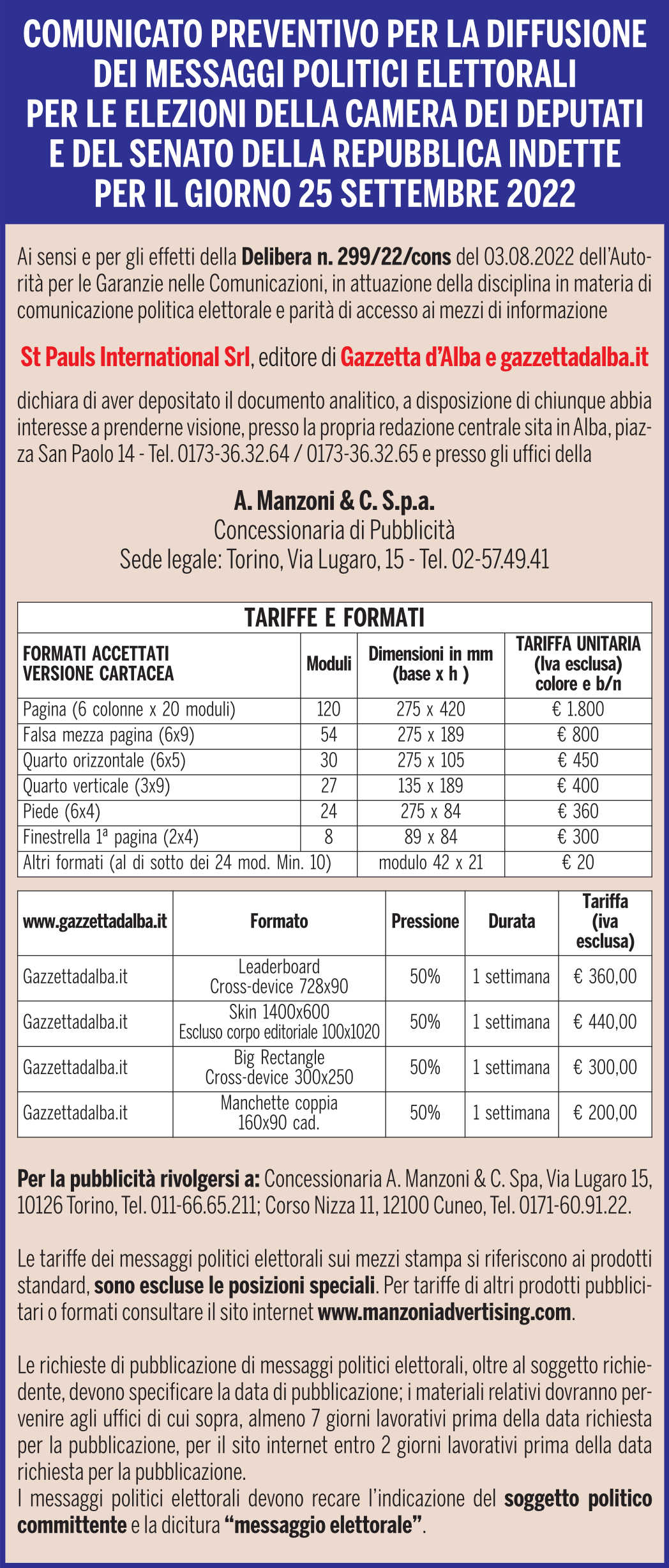 Ai sensi e per gli eff etti della Delibera n. 299/22/cons del 03.08.2022 dell’Autorità per le Garanzie nelle Comunicazioni, in attuazione della disciplina in materia di comunicazione politica elettorale e parità di accesso ai mezzi di informazione St Pauls International Srl, editore di Gazzetta d’Alba e gazzettadalba.it dichiara di aver depositato il documento analitico, a disposizione di chiunque abbia interesse a prenderne visione, presso la propria redazione centrale sita in Alba, piazza San Paolo 14 – Tel. 0173-36.32.64 / 0173-36.32.65 e presso gli uffici della A. Manzoni & C. S.p.a. Concessionaria di Pubblicità Sede legale: Torino, Via Lugaro, 15 – Tel. 02-57.49.41