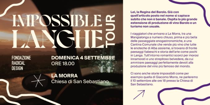 LIBRI Prosegue il tour letterario di presentazione del volume Impossible Langhe, nato dallo sforzo congiunto di Pietro Giovannini (scrittore), Maurizio Beucci (fotografo), Charley Vezza della fondazione Radical Design e Tommaso Delmastro (curatore del progetto grafico), con due nuovi appuntamenti. Il libro che viene definito un romanzo turistico e che ha l’intento di mostrare quanto siano speciali le Langhe, sarà presentato domenica 4 alle 18 alla Chiesa di San Sebastiano di La Morra e domenica 11 settembre alle 11 al festival Pavese nel giardino degli ulivi di Camo.